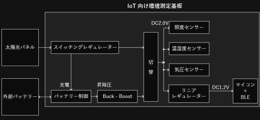 本ボードでは昼間太陽が出ている時は太陽光パネルから得た電力を外部バッテリーに充電しつつ、リニアレギュレーターやスイッチングレギュレーターを通して必要なデバイス(照度センサー、温湿度・気圧センサー、マイコン(BLE+MCU)など各種測定デバイス)に電圧(例:2.0V)を供給します。