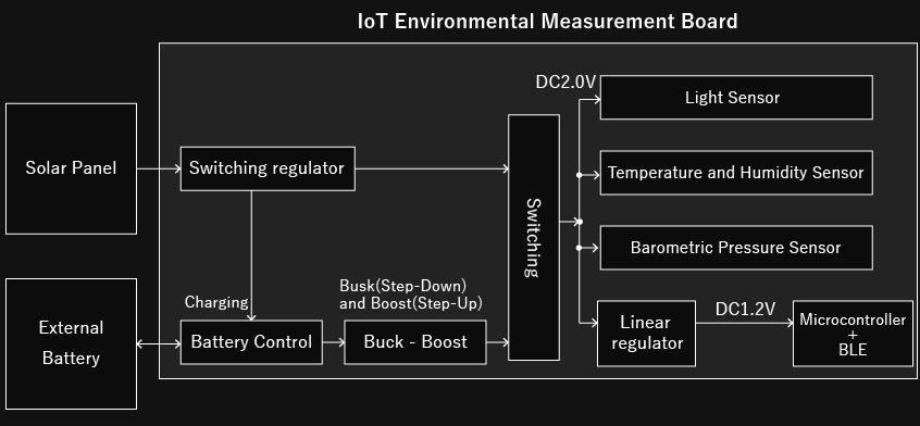 During the daytime when the sun is out, this board charges an external battery with power obtained from the solar panel, and supplies voltage (e.g. 2.0V) to necessary devices (various measurement devices such as light sensors, temperature/humidity/barometric pressure sensors, and microcontrollers (BLE+MCU)) via a linear regulator and switching regulator.