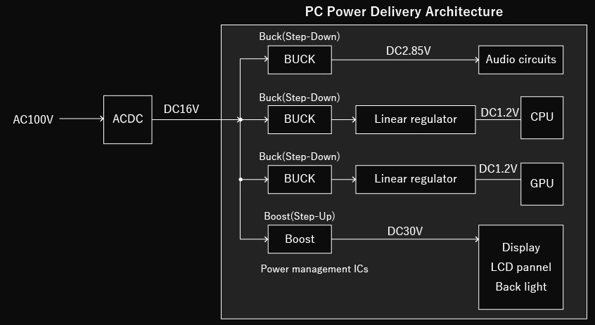 From battery-powered mobile devices, PCs, and IoT (Internet of Things) devices to automotive applications, power management ICs are responsible for optimizing power supply within various electronic devices and are used in a wide range of applications. The diagram below shows a simplified power configuration of a PC, assuming power is supplied from a household outlet. This section introduces power management IC applications, including examples of linear regulators and step-down and step-up switching regulators based on power supply systems.