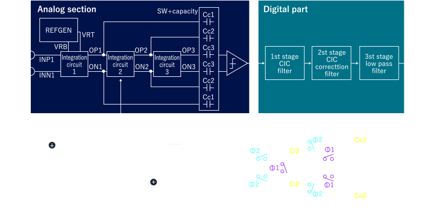 | Point | We conduct stable constant and noise designs for the analog component, and optimize the digital component based on the intended use. This configuration applies to audio equipment and similar applications. If the input is DC, it is possible to omit the correction filter, and the low-pass filter can be achieved with only average processing. |